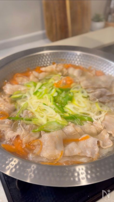 (3) 沸騰してきたら豚バラ肉と長ネギを加えて