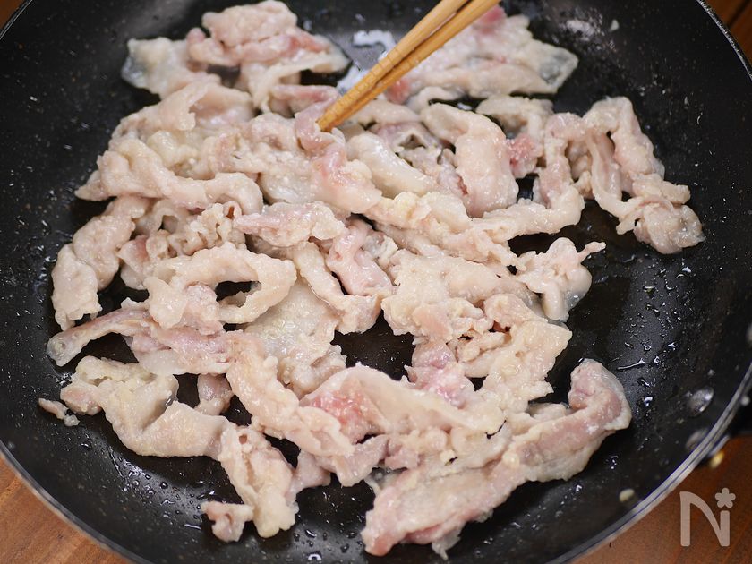 (3) フライパンにサラダ油(大さじ1、分量外)と1の豚肉を入れ、強火で焼き色が付くまで炒めて火を通す。