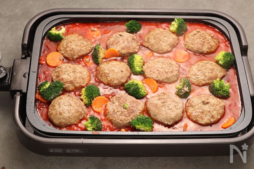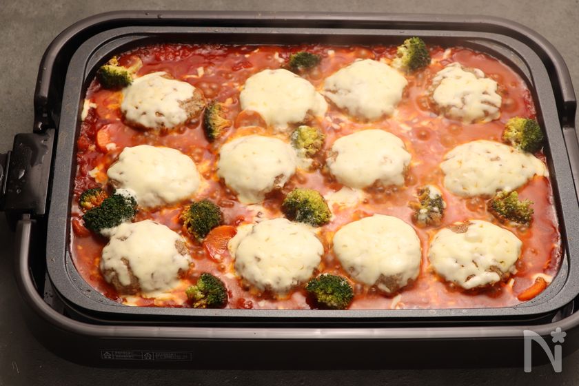 ホットプレートでチーズハンバーグのトマト煮込み