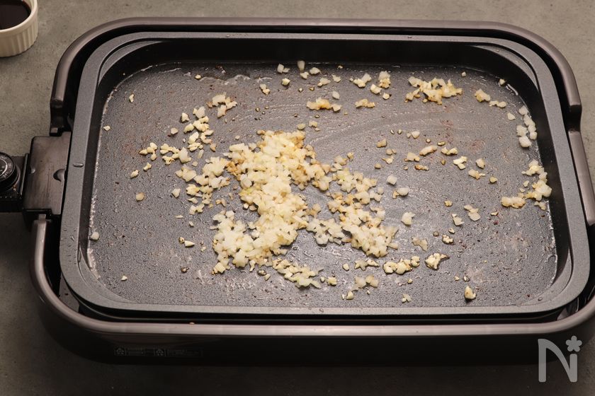 温度調節ダイヤルを180に設定して、サラダ油、にんにく(みじん切り)を入れ、香りがでるまで炒め、玉ねぎ(みじん切り)を加えて3分程度炒める。