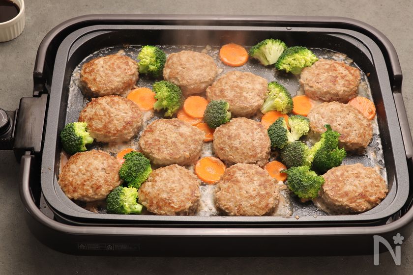 TESCOMのホットプレートは温度調節ダイヤルを230に設定し、サラダ油を全体に広げる。丸めたハンバーグを並べ、表面を焼き固める。すきまにブロッコリー、にんじんをのせて焼き、ハンバーグ両面に焼き目がついたら、ハンバーグ、ブロッコリー、にんじんを取りだしておく。(後で煮込むので、この時点で火が通ってなくて大丈夫です)