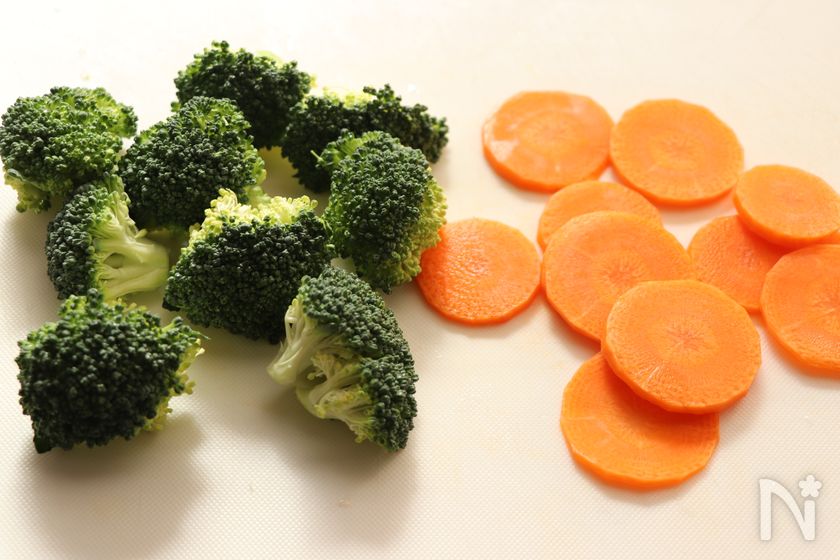 (1) ブロッコリーは小房に分ける。にんじんは皮をむいて3mm幅の輪切りにする。