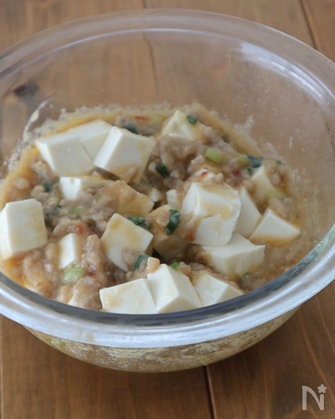 (3) 豆腐を加えて優しく混ぜ、さらに1分加熱する。