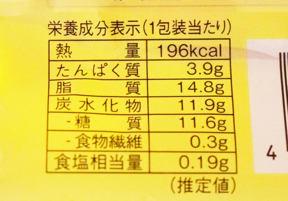 1包装あたり196kcal・たんぱく質3.9g・脂質14.8g・炭水化物11.9g・食塩相当量0.19gです。