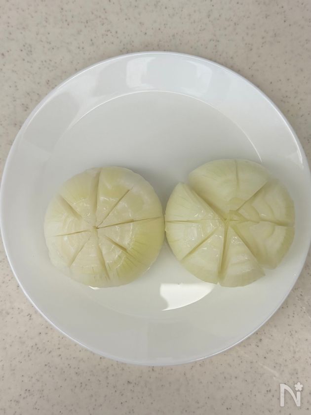 (1) ・新玉ねぎは、深さ2cm程、切り込みをいれる。耐熱容器に入れ、ラップをして、電子レンジ(600w)で、5分加熱する。