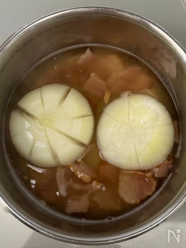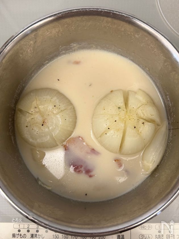 (2) 鍋に、水をいれ、沸騰したら、ベーコン、玉ねぎ、【A】を入れる。弱火で3分加熱する。