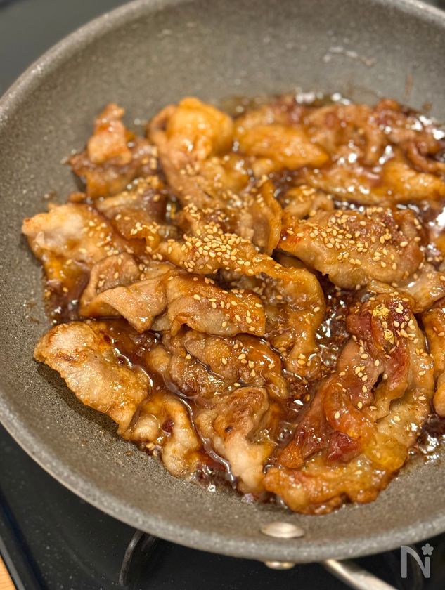 はちみつを使用しているため、たれを加えた後は強火にせず、焦げないよう火加減に注意してください。また、豚バラ肉から脂が多く出るため、焼いている途中で余分な脂を軽く拭き取ると、くどくならず食べやすく仕上がります。片栗粉をまぶしているため、たれを加えた後は加熱しすぎず、照りが出たら手早く火を止めるのがポイントです。