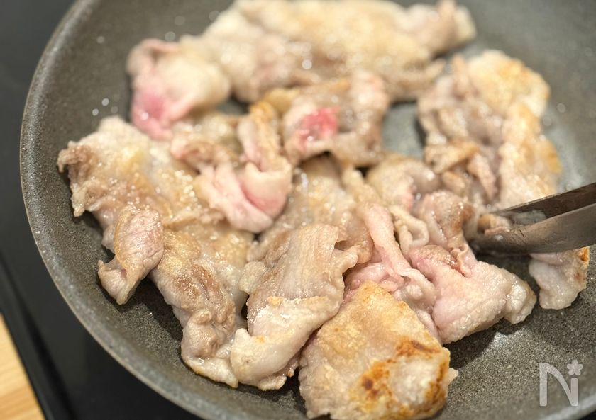 (1) フライパンにごま油・にんにくチューブを入れて中火。香りが立ったら豚肉を入れて焼く。