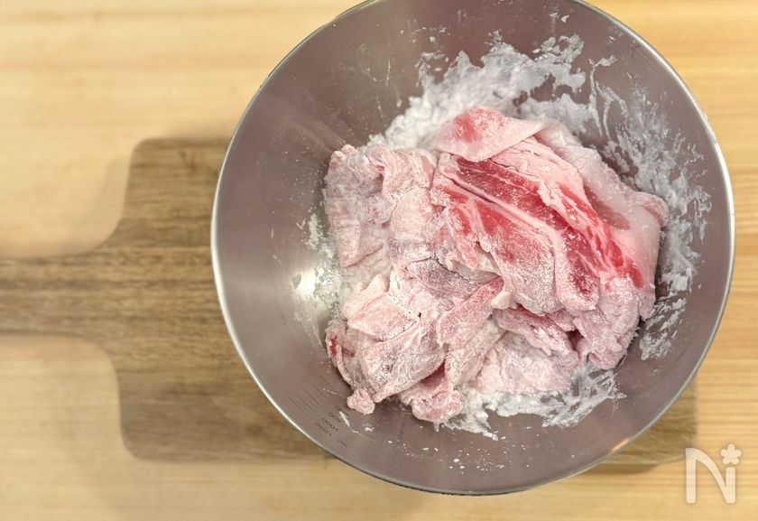 (下準備) 豚バラ薄切り肉は切らずに塩こしょう、片栗粉をまぶす。