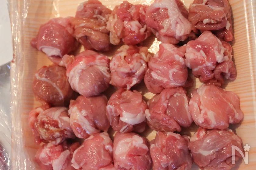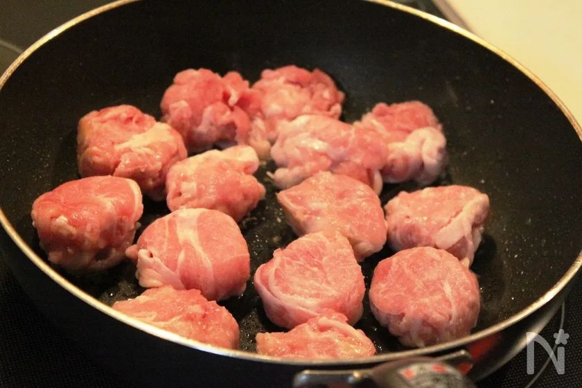 (2) 豚こま切れ肉は【A】をつけたらぎゅっと3cmくらいに握り片栗粉をまぶします。