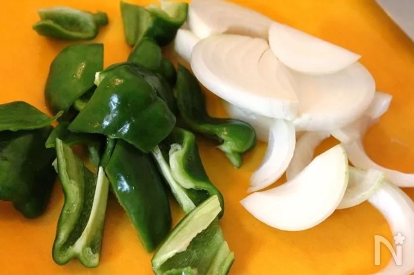 (1) 玉ねぎはくし形切りにし、パプリカ、ピーマンはタネを取り一口大に切る。