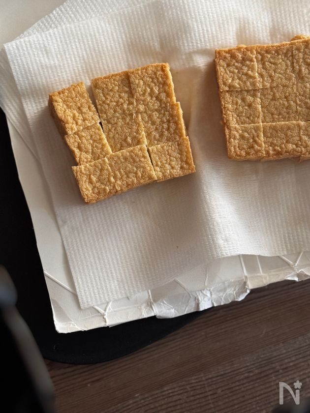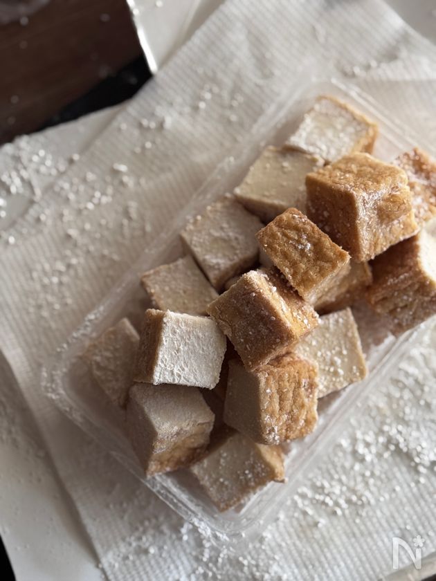 ◎絹厚揚げの水分と油分を拭き取る。片栗粉を満遍なく全面につける。