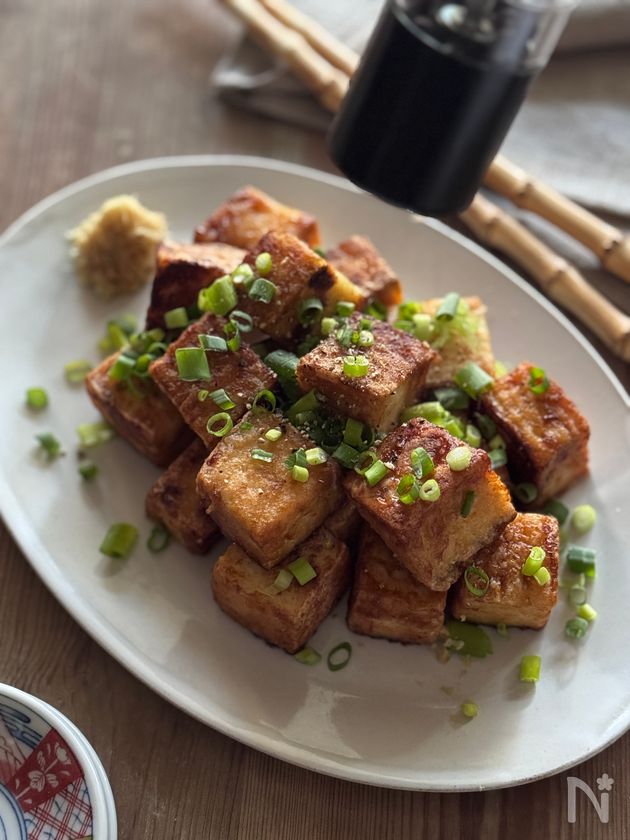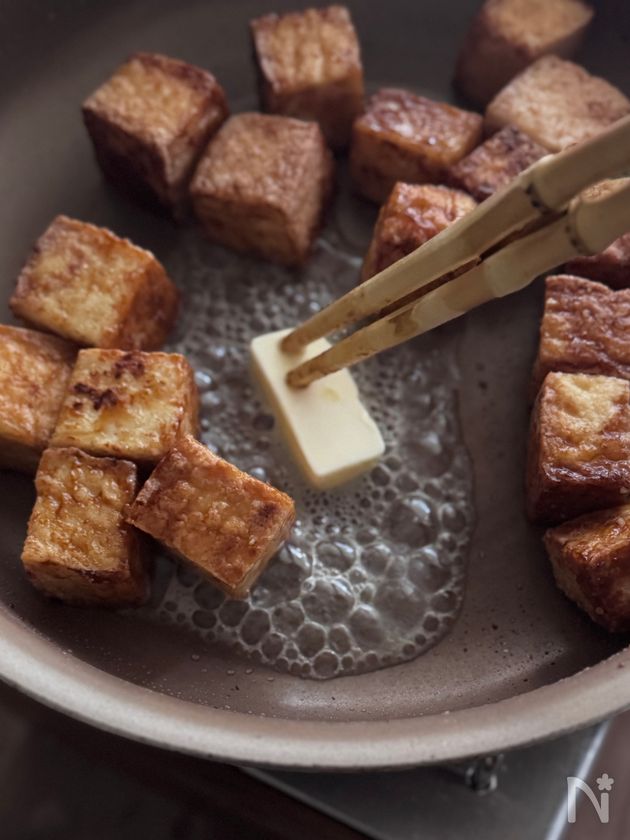 サイコロ絹揚げのバター醤油ステーキ風(黒胡椒たっぷり)