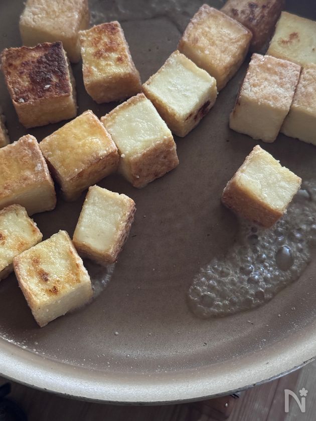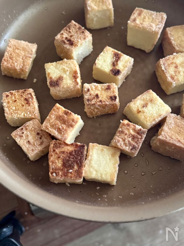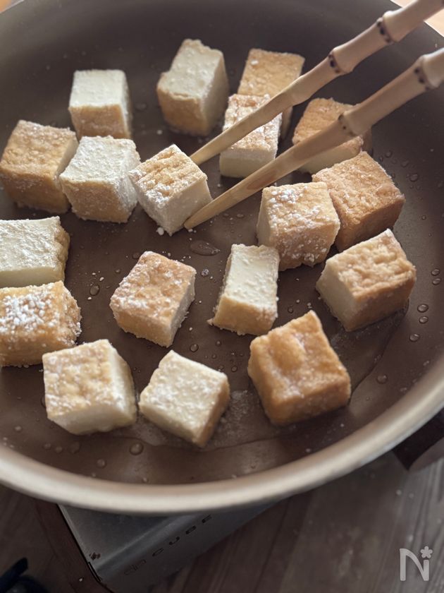 (2) フライパンに米油を中火で熱し、片栗粉をまぶした絹厚揚げを入れる。