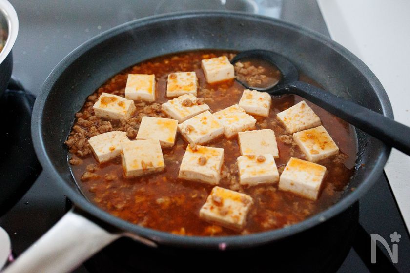 (3) 【C】と豆腐を加えて中火で30秒ほど煮る。