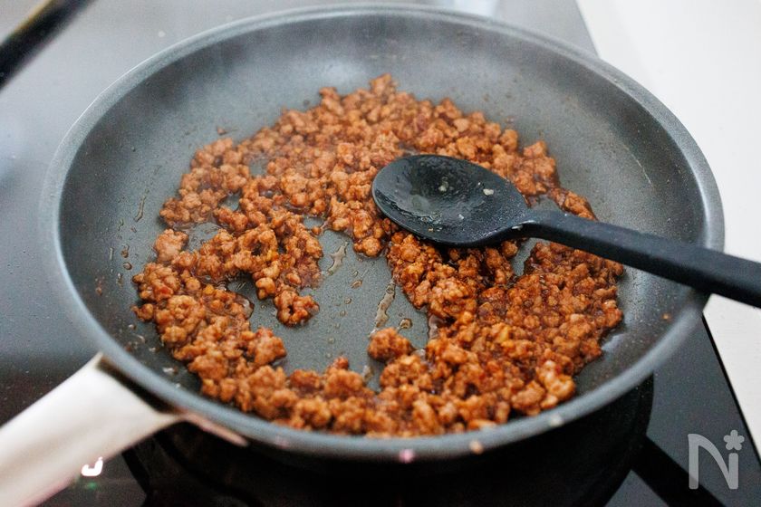 (2) フライパンを中火で熱し、豚ひき肉をほぐしながら炒める。【A】を加えて炒め、【B】を加えて汁気がなくなるまでよく炒める。