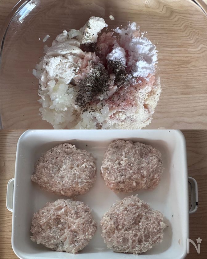 (3) ボウルに鶏ひき肉、木綿豆腐、玉ねぎ、【A】を入れ、粘りが出るまでよく混ぜる。4等分にして空気を抜きながら丸め、平らにする。