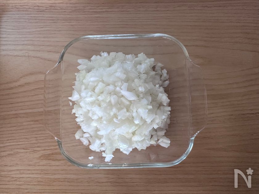 (2) 玉ねぎは、みじん切りにし、耐熱容器に入れ、ふんわりラップをかけ、600Wで1分〜1分30秒加熱。水気を軽く押さえ、しっかり冷ます。