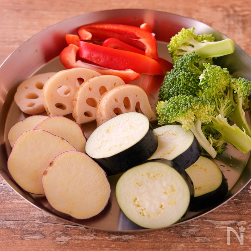 なすは1cm幅、れんこんは5mm幅の半月切りにする。さつまいもは5mm幅の輪切りまたは半月切りにし、赤パプリカは種を取り縦1cm幅に切る。ブロッコリーは小房に分ける。