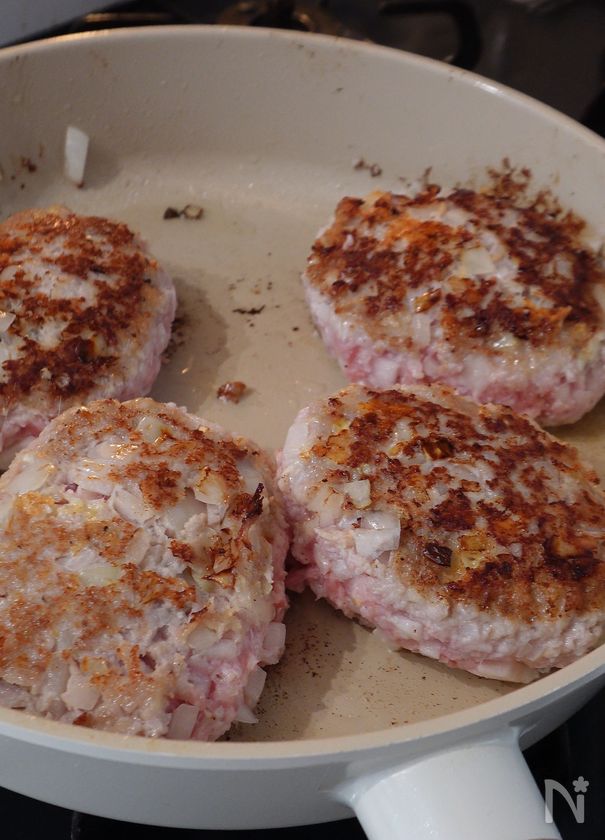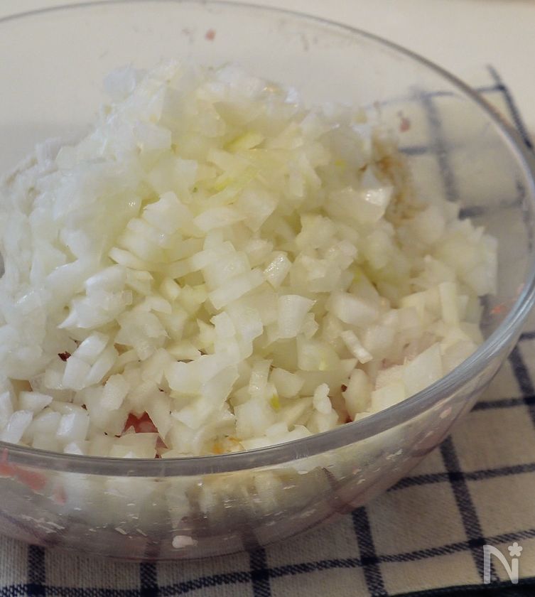 ふやかしたパン粉と玉ねぎを加え、よく混ぜ合わせる。