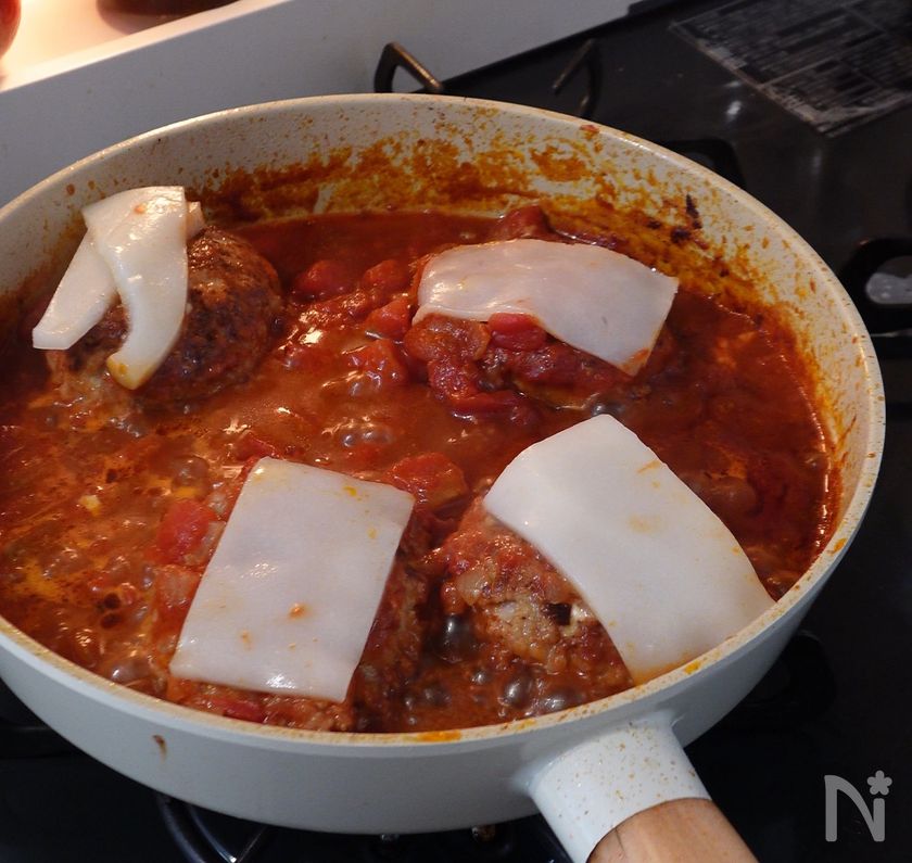 5分経ったら、スライスした餅をハンバーグの上に乗せて、柔らかくなるまで蓋をして加熱する。