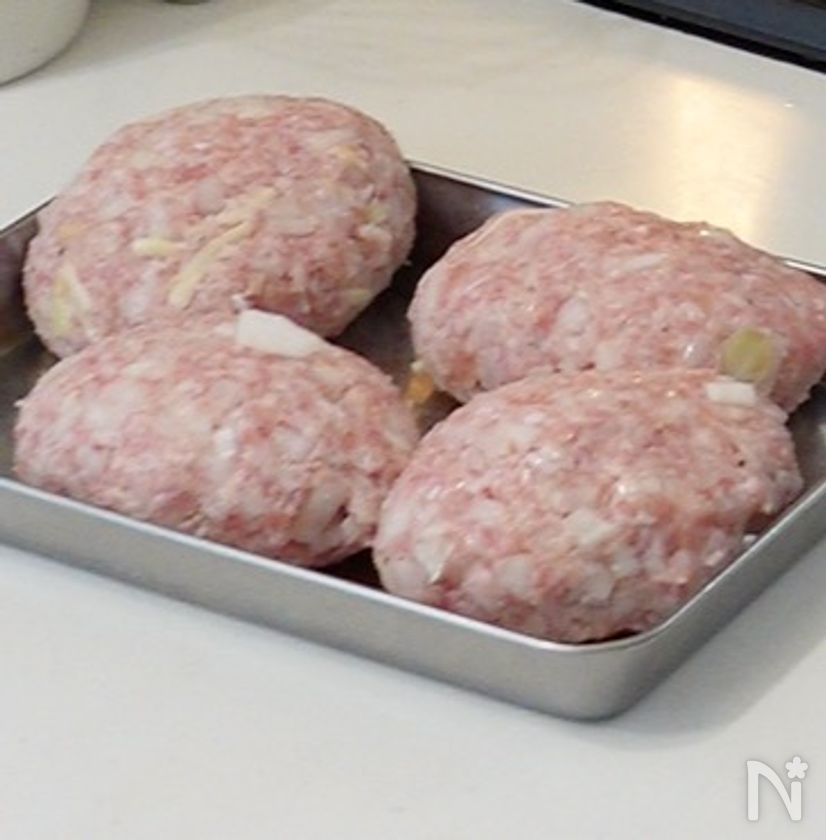 (2) 豚ひき肉250gと塩こしょうを粘りが出るまでこねる。
