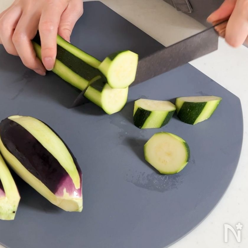 ・なすとズッキーニは皮をむくことで短時間でも味が馴染みやすいようにしています。