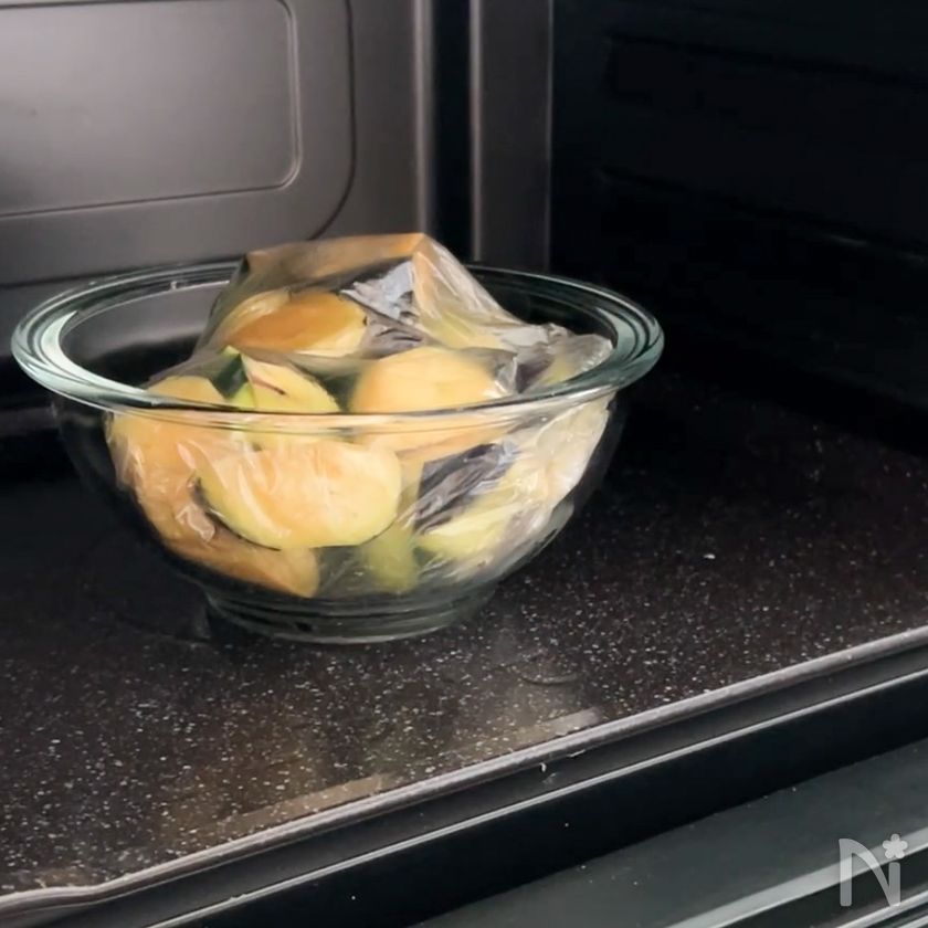 (2) 耐熱のポリ袋になすとズッキーニ、ごま油を入れ、油をよく馴染ませる