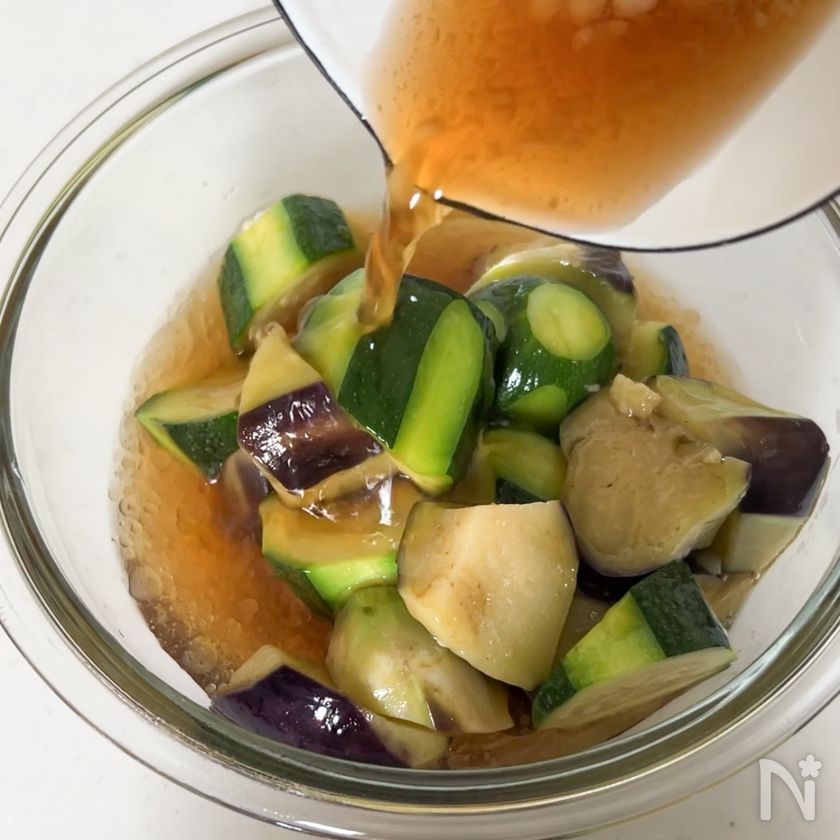 レンチンでしみじゅわ♡【なすとズッキーニの揚げびたし風】
