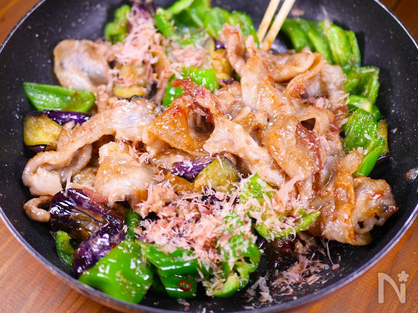 (4) ○なすとピーマンを加え、強火で2分ほど炒め合わせたら、混ぜ合わせておいたタレ(A)を加え炒め合わせる。