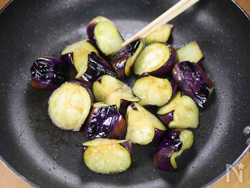 (2) ○フライパンにサラダ油(大さじ1、分量外)となすを皮目を下にして並べ、強火で2分ほど焼く。