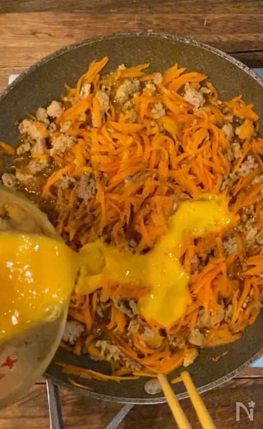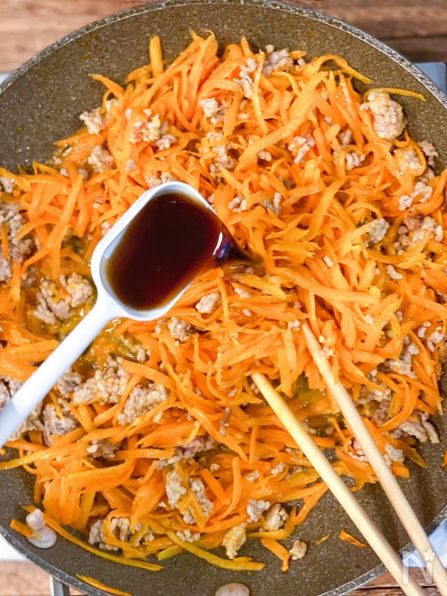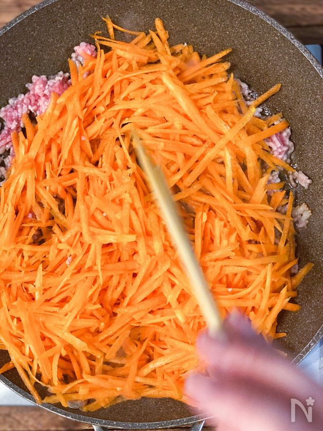 (4) ひき肉に半分火が通ったら千切りにしたにんじんを入れる。