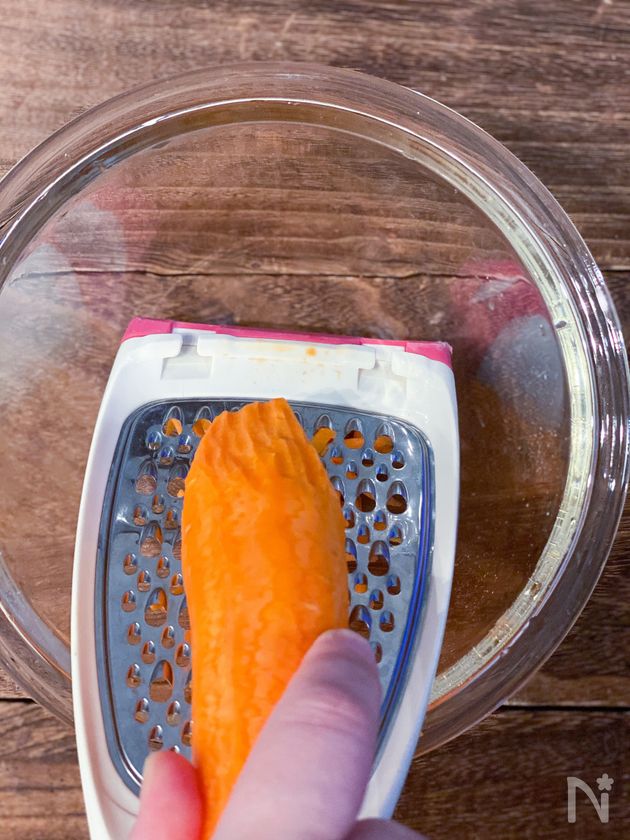 (1) にんじんをスライサーやしりしり器で千切りにする。