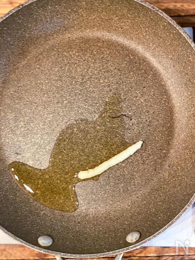 (2) フライパンにごま油とチューブにんにくを入れて温める。
