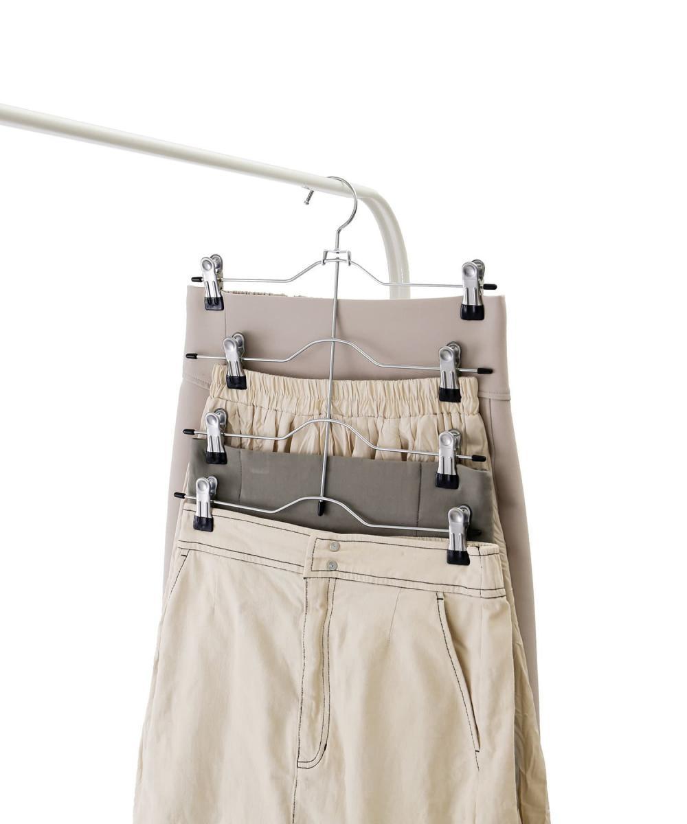 スカートを省スペースでまとめて収納できる4連のハンガーは、クローゼットの整理整頓にぴったりなアイテムです。スチールワイヤーとPVCコーティングで丈夫ながら軽量設計。スカートやパンツを順番に掛けられるので、衣替えや日常の収納がぐっとスムーズになります。