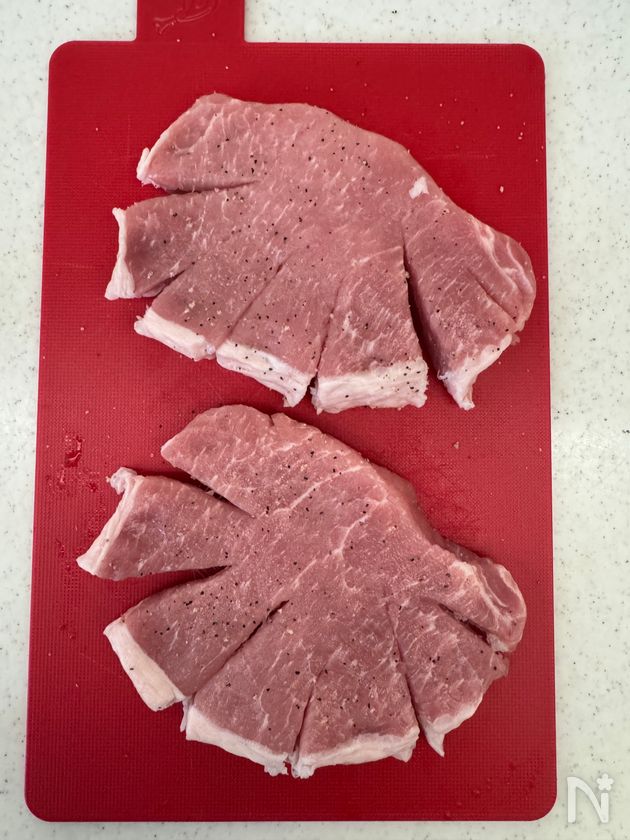 (下準備) ・豚ロース(厚切り)は、めん棒で叩いて、厚さを均一にする。