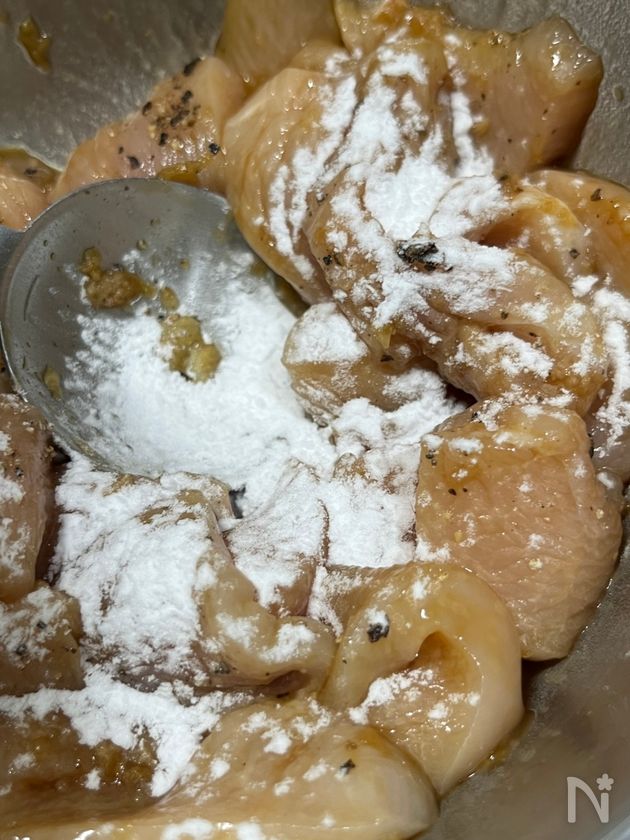 (1) 鶏むね肉はそぎ切りにして、【A】を順番に入れて混ぜ合わせる。