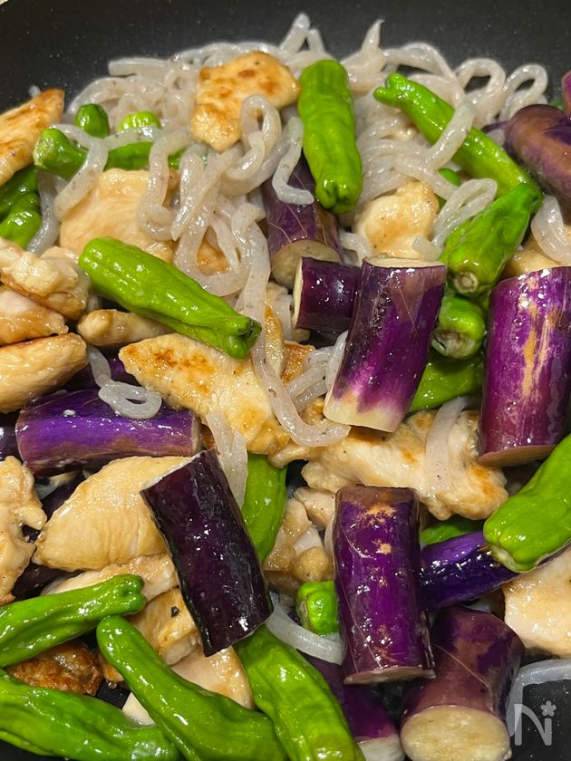 半分くらい焼けてきたらナスとししとうと糸こんにゃくを入れて炒める。