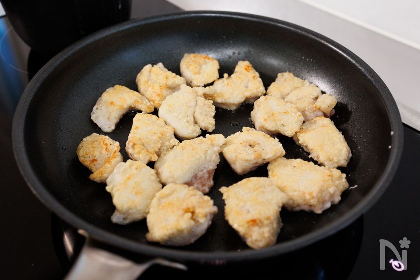 (2) フライパンにサラダ油を中火で熱し、鶏肉を並べる。片面に軽く焼き色がついたら裏返し、火を止めて手早く取り出す。