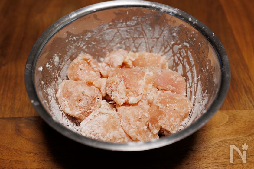 ◯鶏むね肉は酒をもみ込み、片栗粉をまぶすことで、やわらかく仕上がります。