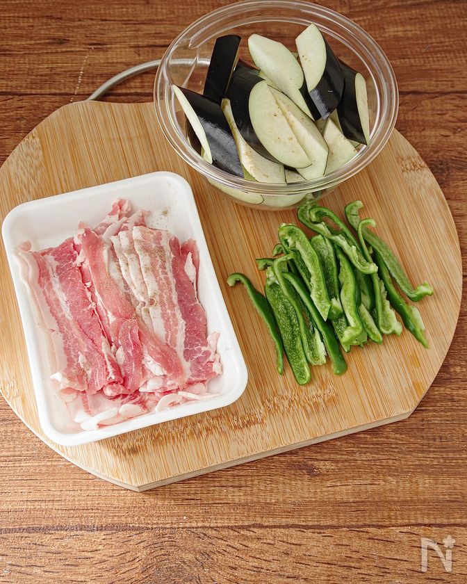(1) なすは縦半分に切り、斜め1.5cm幅に切る。ピーマンは1cm幅の細切りにする。豚バラ薄切り肉は食べやすい大きさに切り、塩こしょうを振る。