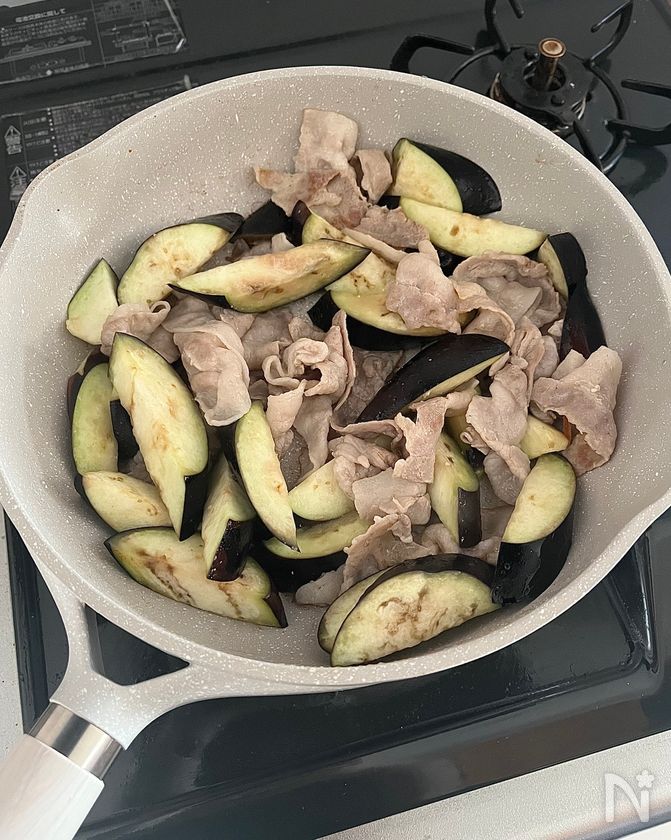 (2) フライパンにごま油を中火で熱し、豚バラ肉を炒める。色が変わってきたらなすを加え、しんなりするまで3分ほど炒める。