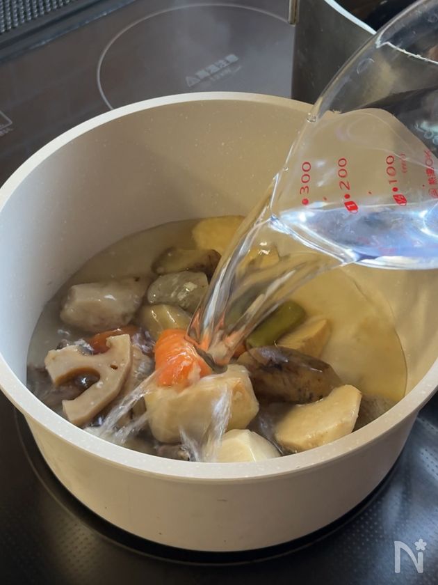 (1) 鍋に残った筑前煮と水を入れて火にかける。