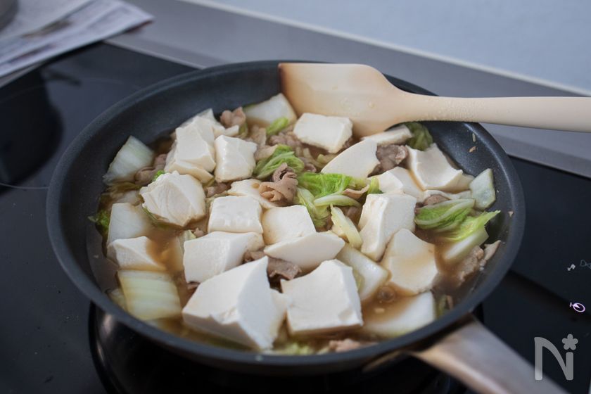 (3) 【A】を加えて混ぜ、煮立ってきたら絹ごし豆腐をスプーンで食べやすい大きさにすくって加え、さっと煮る。