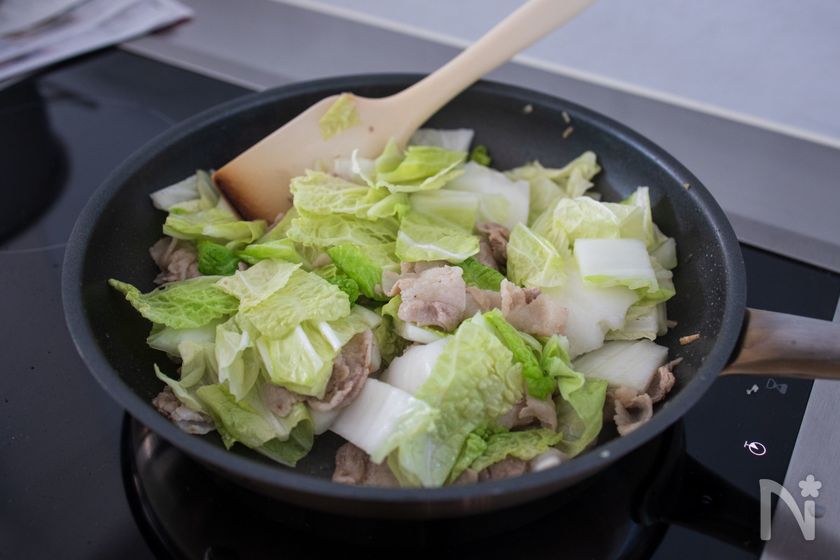 (2) フライパンにサラダ油を中火で熱し、豚肉と生姜のみじん切りを入れて炒める。肉に火が通ってきたら、白菜を加えて軽くしんなりするまで炒める。