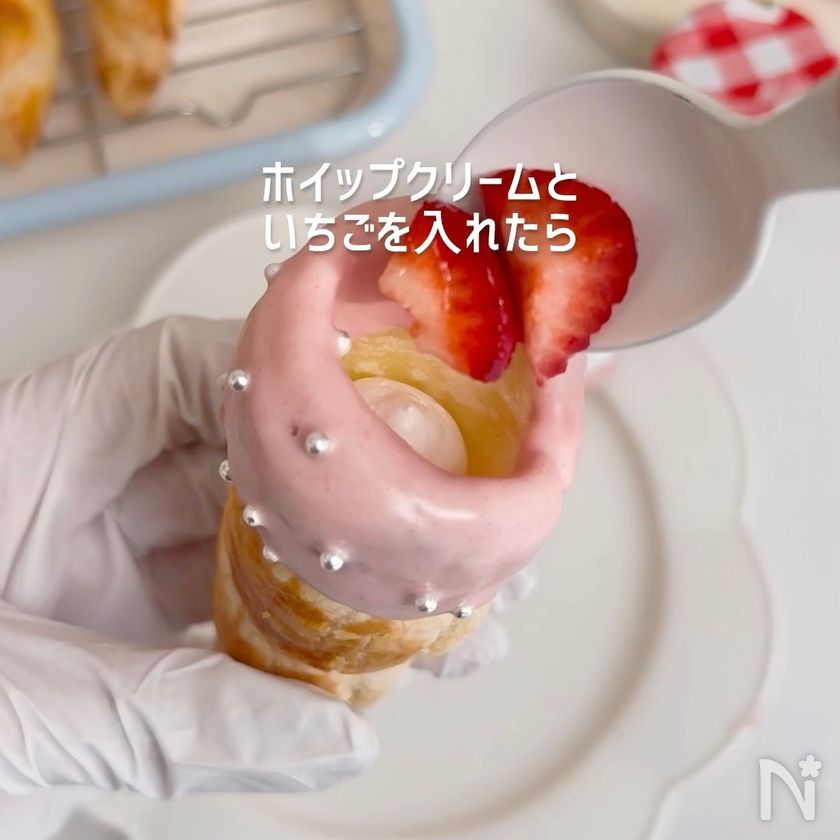 (4) コロネの中にホイップクリームといちごを入れ、先端にいちごを飾る。
