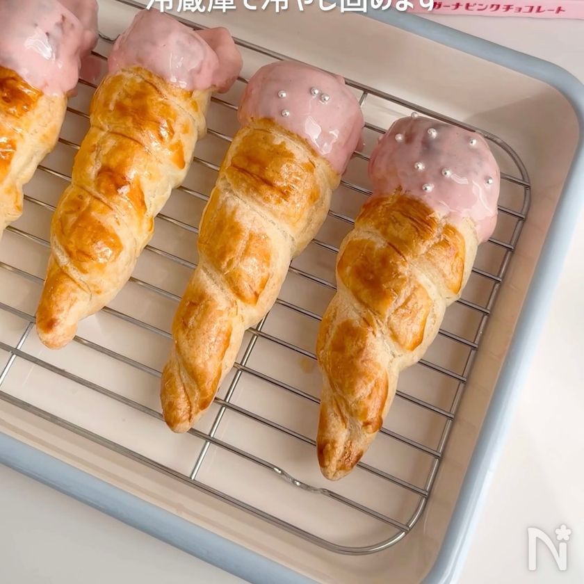 (3) 粗熱が取れたらコロネの入り口側に板チョコレートを付け、お好みでアラザンなど飾り、冷蔵庫でチョコレートが固まるまで冷やす。