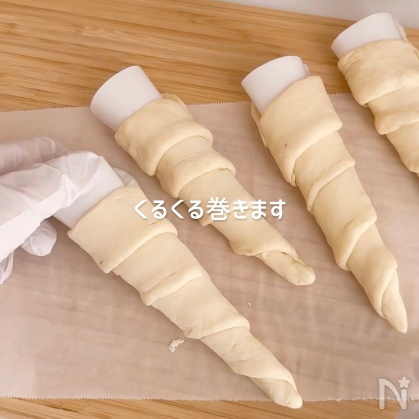 (2) パイシートをコロネ型に巻き付ける。お好みで卵黄をぬり、予熱した200℃のオーブンで15〜20分焼く。
