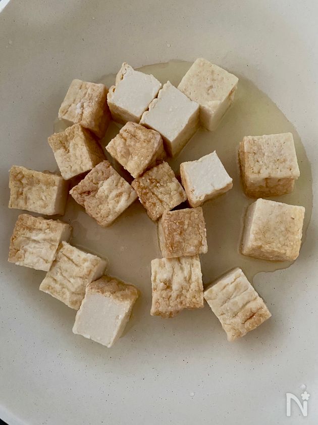 (1) こめ油をひいたフライパンを熱し、絹揚げを転がしながら中火で3分焼く。