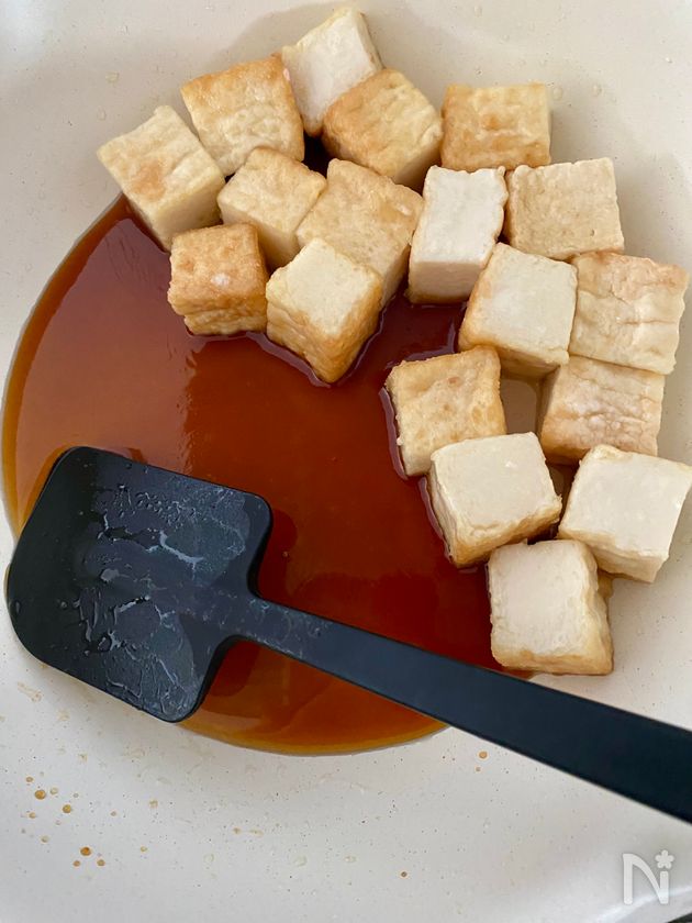 (2) 絹揚げをフライパンの端に寄せ、キッチンペーパーなどで余分な油をふきる。空いているところに【A】を入れて混ぜ、中火でタレを絡ませながら1分30秒ほど炒める。
